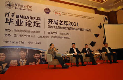 Continuing with the first round of “supporting regional economy” events, the Tsinghua EMBA Program carried out a series of activities in Sichuan Province to support the economic development of the Southwest region. The activities took place during January 20-24, 2011, including graduation forums, a “Mobile Campus,” a Seminar on Chinese Culture, alumni association ceremonies, an EMBA New Year party and visits to local enterprises.