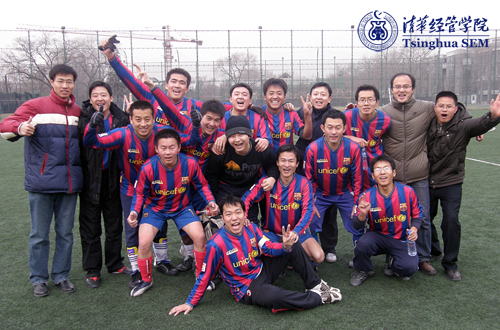 Tsinghua SEM MBA team took first place in the fourth MBA Football League of Beijing-Tianjin Division. In the final held on December 12, Tsinghua SEM team was disadvantaged with 0-1 at the end of first half. Then in the second half, SONG Changyou and ZHENG Xuejun, playing on the forward line and the half back, contributed two goals and the team overtook Peking University MBA team. SONG Changyou was awarded “Best Shooter” of the fourth league with a record of 7 goals.