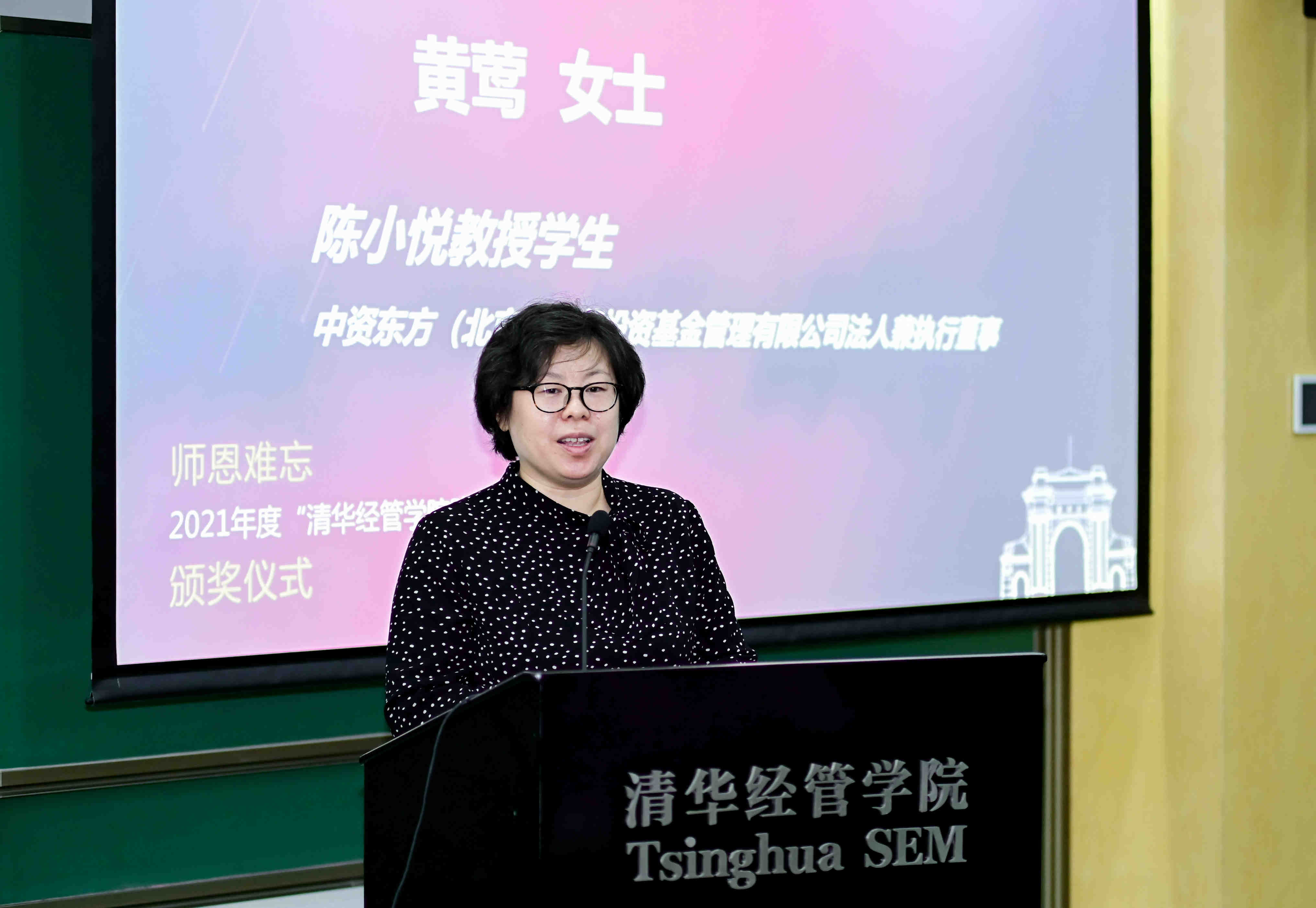随后,黄莺代表陈小悦教授的学生发言。她讲到,陈小悦教授很早就意识到会计国际化的趋势,并在课程设计上结合了国际化教学。当时培养的一大批人才输送到政府、企业及金融机构,推动了国家经济发展。黄莺希望各位同学通过更加积极和开放的心态迎接变化,今后获得更优异的成绩。