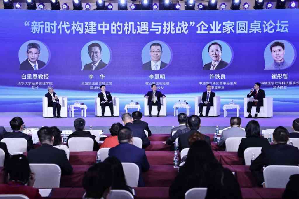 圆桌论坛环节,白重恩与卓越集团董事局主席李华、中油燃气集团董事局主席许铁良、敬业集团总经理李慧明、海纳医信软件科技董事长崔彤哲四位校友,围绕“新时代构建中的机遇与挑战”主题,探讨企业高质量发展的战略布局与实践经验。
