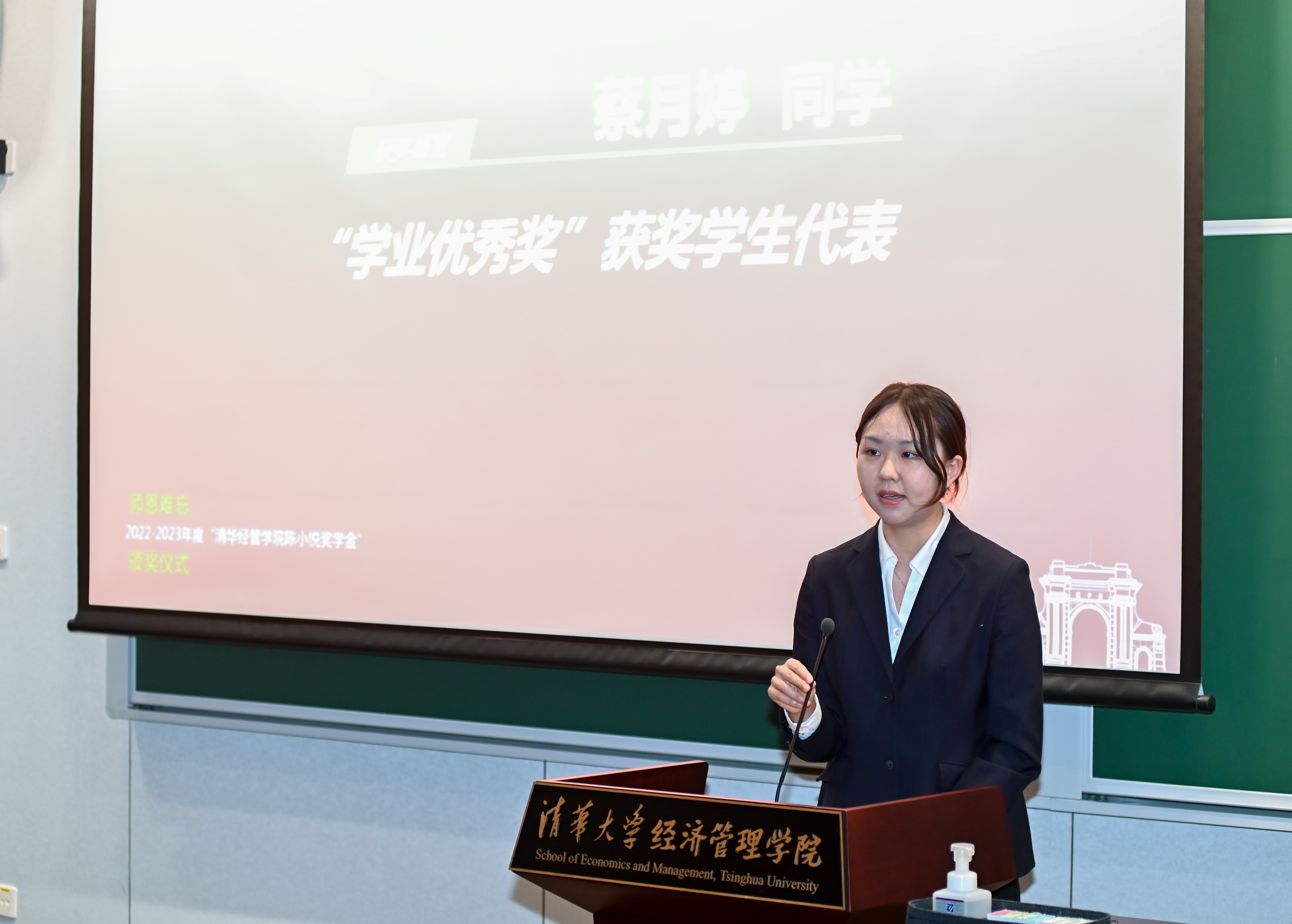 最后,学院经92班蔡月婷代表“学业优秀奖”获奖同学发言。蔡月婷感谢陈小悦基金委员会对同学们的鼓励与期望。陈小悦奖学金不仅是自己过去成绩的肯定,更是对今后自强创新、不断进取的激励。希望大家把陈小悦奖学金看作一份荣誉、一份责任,在今后的成长道路上获得更好的成绩。