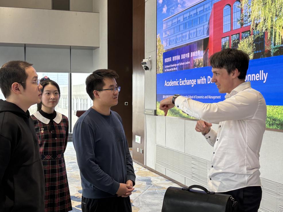 在当天中午举行的座谈交流会上,学院党委副书记刘庆,EMBA教育中心主任助理安静,拜耳医药保健有限公司处方药事业部数据科学与客户洞察总监、2010届TIEMBA校友王威,2023级博士研究生张可欣、方净植,2024级GMBA学生任锐锋,2024级博士研究生余春妍及多名博士研究生代表参加。大家与布兰登·唐纳利就AI赋能学术研究、商业模式创新等议题展开对话,促进学术观点和行业经验的碰撞融合。