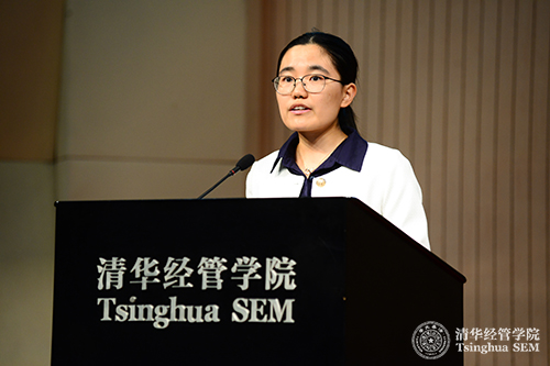 管双14班、化学工程系的刘伯阳同学作为老生发言。刘伯阳认为自己的本专业可以培养人严谨和缜密的逻辑,在专、精、深上有所获益。而管理学二学位则让人打开新的视野,在管双不仅能学到管理学知识,更能开拓视野,让人从新的角度看待世界。管双15班创新创业领导力方向、新闻与传播学院的蒋佩妍同学作为新生发言。她以自己为例阐述了管理学加新闻传播在多元知识结构和创新方面所带来的优势,并借此引出管理学加其他学科所能带来的无限可能。