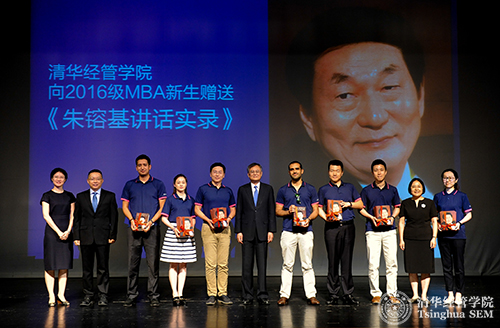 钱颖一院长代表清华经管学院在清华MBA开学典礼上向2016级MBA新生赠送《朱镕基讲话实录》