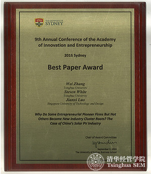 清华经管学院张帏教授和白思迪教授合作的论文“Why do some entrepreneurial pioneer firms but not others become industry cluster roots? The case of China's solar PV industry”获得了本届AIE会议的最佳论文奖,这也是威尼斯432888cam投稿学者首次获得该奖项。