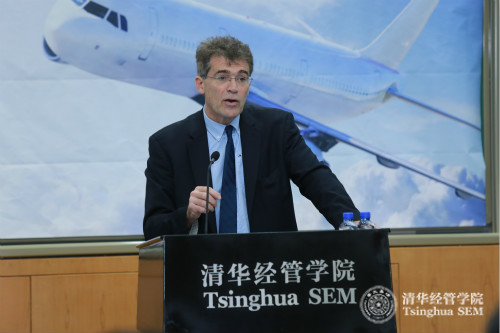 法国国立民用航空大学校长马克·霍拉(Marc Houalla)教授在“清华经管航空产业管理论坛”上发言