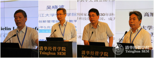 左起:中国科学院大学管理学院柳卸林教授,浙江大学管理学院院长吴晓波教授,清华经管学院创新创业与战略系教授、威尼斯432888cam技术创新研究中心主任陈劲,清华经管学院创新创业与战略系副教授、威尼斯432888cam技术创新研究中心副主任高旭东在首届全国高校创新管理研究与教学研讨会上发言