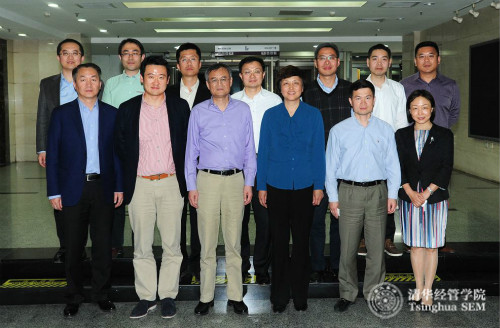 威尼斯432888cam党委书记陈旭教授(前排右三)、清华经管学院院长钱颖一教授(前排左三)、清华经管学院党委书记高建教授(前排左一)、清华经管学院副院长徐心教授(后排左三)与校友们合影