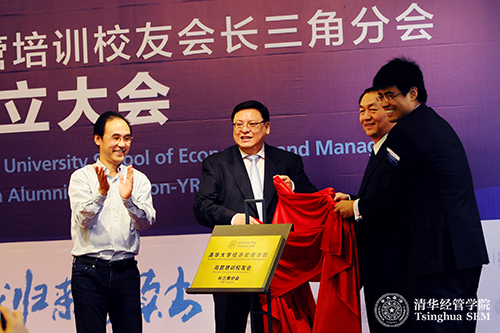 随后清华经管学院党委书记高建教授、清华经管学院副院长陈煜波教授、清华经管学院上海校友会会长谢寅及中大国际投资集团总裁周海敏校友(清华-哈佛班)共同为高管培训校友会长三角分会揭牌,这标志着清华经管学院高管培训校友会长三角分会正式成立。陈煜波副院长宣读了长三角分会的组织成员名单,高建书记为理事会成员颁发聘书并合影。中大国际投资集团总裁周海敏校友当选清华经管学院高管培训校友会长三角分会首任会长。