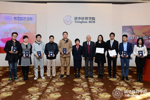 吴敬琏理事长(右五)、小林经子女士(右六)向获得2015年度小林实中国经济研究论文奖的10名同学颁奖