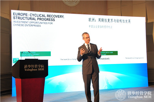 随后,法国巴黎银行首席经济学家William DE VIJLDER作了题为“欧洲:周期性复苏和结构性发展——对中国企业的投资机会”的主旨演讲。William DE VIJLDER在演讲中用详实的数据介绍了在全球化的框架之下欧洲扮演的角色,提出欧盟正在经历周期性复苏、结构性发展的观点。