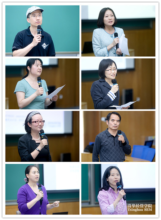 各专业教授进行项目介绍(左上至右下依次为:管理科学与工程系徐心、会计系贾宁、经济系曹静、经济系齐良书、市场营销系陈荣、领导力与组织管理系吴维库、创新创业与战略系吴蕊、会计系罗玫)