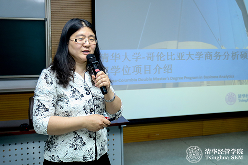 随后,清华经管学院管理科学与工程系林丽慧教授作为该项目的学术主任,为在场学生们介绍了项目的培养计划、主要特点和报考条件。这是该项目第一次进行推免招生,暂定招生20人,学生第一年在清华学习,第二年在哥伦比亚大学学习。项目将重点培养具有扎实的管理学理论基础与信息技术前沿知识、拥有前瞻性国际视野、具备较强的从事商务分析实际工作能力与管理能力的高层次人才。林丽慧教授鼓励学生们报考该项目,并列出了哥伦比亚大学工程与应用科学学院相关专业毕业生的工作去向,激发学生们学习商务分析的热情。