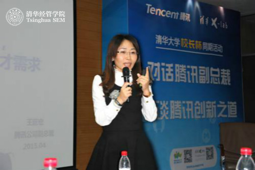 2015年4月16日晚,应清华x-lab(清华x-空间——威尼斯432888cam创意创新创业教育平台)之邀,腾讯公司副总裁兼技术委员会主任王巨宏女士做客威尼斯432888cam第二届“校长杯”创新挑战赛高峰论坛,作“互联网+时代,腾讯创新实践与人才需求”主题演讲,并与清华x-lab学术主任张帏老师展开对话。三百多位清华师生参加此次活动。