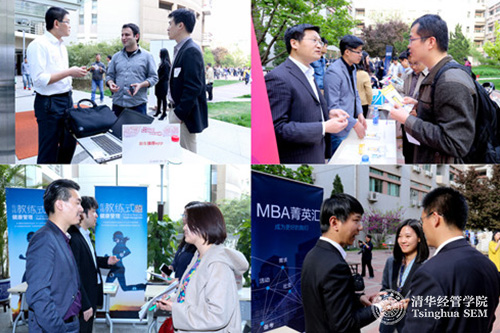 在舜德楼大厅及庭院的展位四周,创业项目现场洽谈同时进行,清华MBA各级在校同学、2015级预录取同学、各级校友及现场的参会各界人士参与其中,还有人随即加入了创业团队。“让大家一起携手点创新明灯,燃创业火种!”的大赛主题口号深入人心。