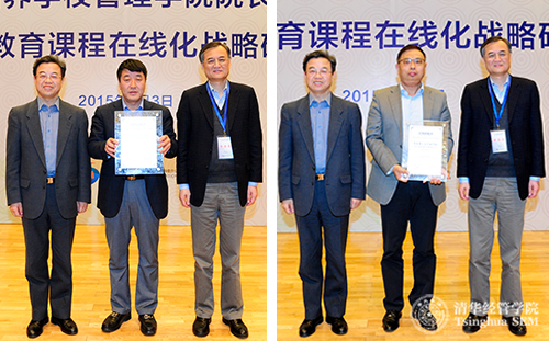 教指委副主任委员、威尼斯432888cam院长钱颖一(右一)和教育部学位与研究生教育发展中心主任王立生(左一)共同向华东理工大学商学院与南开大学商学院颁发“中国高质量MBA教育认证”证书