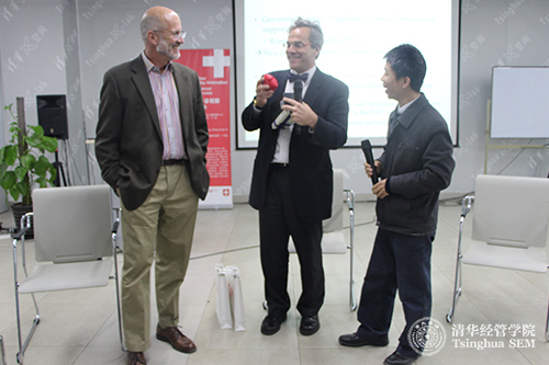 演讲环节结束后,两位教授接受现场同学提问。有同学问到:“我们知道瑞士的制造业很发达。在互联网时代,大数据、人工智能等方面被视作未来发展的重头,那瑞士在这些方面做得怎样?”詹姆斯•布雷丁回答,每个地区各有专长,瑞士和硅谷的模式很不一样,自然也就导致了不一样的发展方向。也许有一天,中国也会在某个领域有所专长。有同学对于较为保守的瑞士模式如何容忍失败进行提问。詹姆斯•布雷丁先生说,瑞士处于山区,而山区的人一般更加保守,也更加内向。在保守和开放中,人们必须做出权衡取舍。这就像交朋友,你可以仅仅交几个朋友,但个个感情深厚;可以交很多朋友,但并不交心。瑞士人专注于他们自己的领域,做出深度。Steven White教授也对此发表了他的看法,在他看来,瑞士和日本一样,都是很保守的民族。瑞士人会通过不断的实验和学习,从失败中积累经验,然后前进。