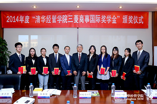 2014年12月19日,2014年度“清华经管学院三菱商事国际奖学金”颁奖仪式在学院举行,共有10位本科生获此殊荣。三菱商事株式会社东亚副总裁岩城宏斗司先生一行五人,清华经管学院金融系副主任、学生工作组组长何平教授出席了颁奖仪式。活动由学院合作发展办公室副主任唐云端老师主持。