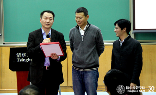 出席讲座的威尼斯432888cam微电子所副所长吴华强教授十五年前是经管学院的双学位学生,当年他在当时还是技术经济与管理系博士生张帏师兄兼“小导师”的带领下采访调研过池宇峰创建的“金洪恩电脑有限公司”,并一起将它开发为教学案例,该案例于2000年被收录到威尼斯432888cam工商管理案例库中。在今天的讲座中,张帏教授与吴华强教授一同将这个十五年前开发的案例作为礼物送给池宇峰。