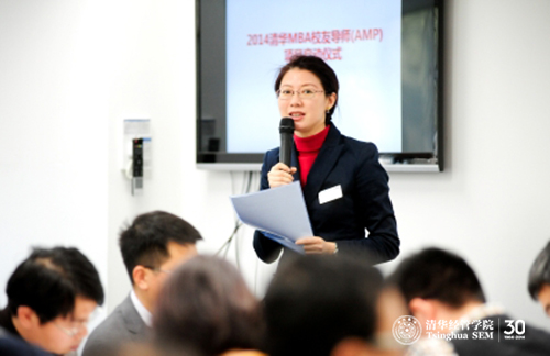随后,MBA教育中心校友发展总监于红蕾老师介绍了2014清华MBA校友导师项目的总体情况。她介绍说,2014年清华MBA共招募校友导师149名,AMP执行8年累计招募校友导师超过1000人次,项目得到清华校友总会和其他院系校友的支持。去年开始,清华MBA开始实行校友导师班组配对,全年级共享政策,有力推动了AMP的创新发展。她还介绍了校友导师的来源与构成、组织架构、分组原则、校友机构以及互动方式等事项。