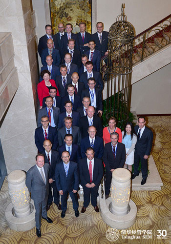 课程欢迎晚宴于2014年9月21日在清华科技园启迪俱乐部举办。宝马集团副总裁托马斯•弗兰克(Thomas Frank)先生和清华经管学院中国与世界经济研究中心主任李稻葵教授出席晚宴。