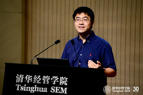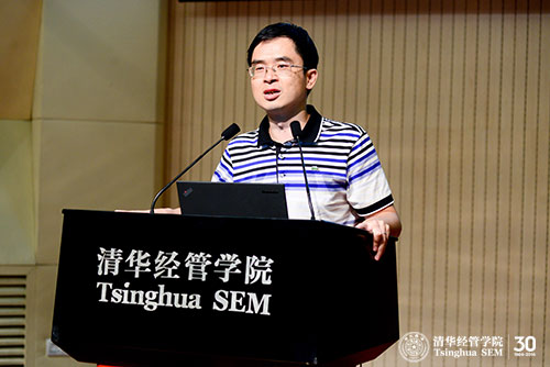 活动第一部分为本科专业及课程体系介绍。首先,郭迅华教授介绍了信息管理与信息系统专业的学科特点及课程体系,他以当天苹果公司发布的智能手表为切入点,提出了一系列管理问题,并就此解释了什么是“信息管理与信息系统”以及它的学科背景、机遇和挑战、意义以及培养目标。他还对比了信息管理与信息系统专业2014届和1994级本科生的去向,他希望同学们不要关注于知识短期的有用、无用,要培养综合性、软硬结合的能力,从而实现多样性的发展。