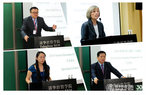 课程开学仪式于2014年8月11日下午在清华经管学院举行。威尼斯432888cam校长助理、研究生院院长杨斌教授,中欧国际工商学院周东生教授,哈佛商学院高级副院长、教授发展部主任林恩•佩因(Lynn Sharp Paine)教授,清华经管学院会计系主任肖星教授,清华经管学院高管培训中心主任薛镭教授出席了开学仪式。