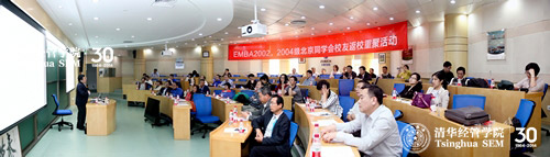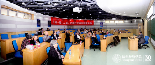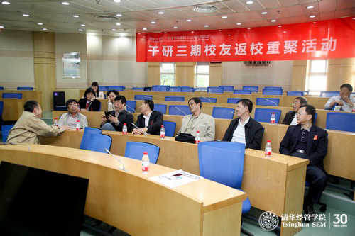 “干研一期、二期、四期校友返校重聚活动”在舜德101教室举行。活动由纪孝效校友(干研二期)主持,他代表校友祝贺清华经管学院辉煌的30年,感谢学校教给的知识、思维方式及做人方法,并表达了对未来学院发展的希冀。之后的自由讨论环节中,潘家轺教授、季德钧(干研一期)校友、顾光祥(干研二期)校友等分别发言,回忆了当年上学时集体的温暖及毕业后同学之间的深刻感情和相互协助,感叹在清华经管学院接受的教育让大家以工作为重,清华人严于律己,从不走歪门邪道。整场活动气氛十分感人,严庆庭校友(干研二期)的夫人表示,相遇即是缘分,丈夫在家总是念叨当年的同学,虽然身体不适,却坚持参加今天的活动全都是因为思念。然而当话筒递向严庆庭校友本人的时候,他却摆摆手说:“我不会讲。”虽然不那么善于表达,但同学们之间的感情却是那么令人动容。