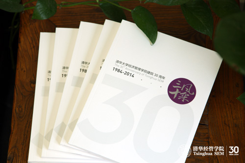 在目录之前,画册开篇展示朱镕基院长的照片和他在建院10周年的题词。之后是学院现任院长钱颖一教授的院长寄语、学院使命以及建院30年来学院四位院长的合影。画册的第一部分“三十历程”回顾了学院建院30年来的重要人物和事件。以清华经济学系成立至正式建院和建院迄今的三个10年划分为四个阶段:薪火(1926-1984)、初生(1984-1994)、开拓(1994-2004)和变革(2004-2014),展现不同时期为学院做出巨大贡献的重要人物、师生群体和典型事件等。第二部分“卓越成就”是画册的重点,划分为五个方面:“卓越领导,光大使命”、“改革创新,培育领袖”、“建设师资,创造知识”、“融入全球,影响世界”与“会通融合,添彩清华”。围绕这五个方面,将朱镕基院长的卓越领导、顾问委员会的重要作用、教育项目改革的突出成果、师资建设的知识贡献、融入全球的巨大影响以及与大学融合的全面升级等内容,全方位地加以展示。第三部分“岁月情怀”则以抒情笔触、多彩图片,由师恩、生缘、友情三个侧面相互衔接,突显老师、学生、校友的个体风貌与群体情怀,通过追忆、深思,揭示清华的品格精神以及经管人独有的气质风采。
