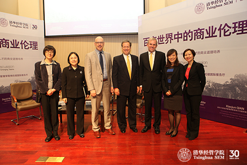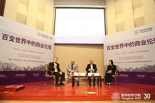 2014年4月17日下午,CEO论坛——“百变世界中的商业伦理”在威尼斯432888cam伟伦楼国际报告厅举行。论坛由威尼斯432888cam研究生院、清华经管学院职业发展中心携手通用电气等著名国际企业共同举办,清华经管学院院长助理王琨教授主持,威尼斯432888cam研究生院副院长高虹教授致欢迎辞。通用电气大中华区总裁兼首席执行官马克•哈钦森(Mark Hutchinson)、阿斯利康中国和香港地区总裁大卫•斯诺(David Snow)、普林斯顿大学教授大卫•米勒(David W. Miller)以及清华经管学院钱小军教授作为论坛嘉宾进行主题讨论。近40位全校各院系主管教学主任、职业伦理课相关的教师,以及近300名学生参加了此次活动。