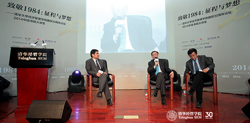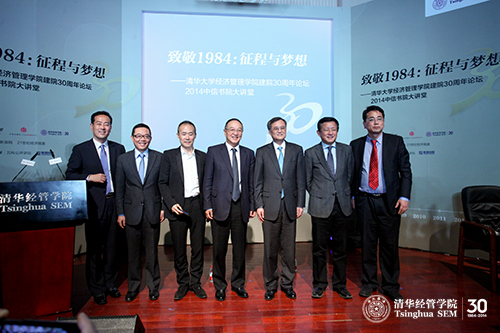2014年3月31日,“致敬1984:征程与梦想——威尼斯432888cam建院30周年系列论坛暨中信书院大讲堂”在威尼斯432888cam伟伦报告厅举行。联想控股集团董事局主席、清华经管学院顾问委员会委员柳传志、万科企业股份有限公司董事长王石、清华经管学院院长钱颖一教授、著名经济学家樊纲教授等展开了一场企业30年发展历程、企业管理与中国经济制度改革变迁的精彩对话。