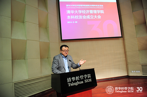 随后,清华经管学院院长钱颖一教授致辞。他首先感谢各位校友从世界各个角落,从不同的岗位回到母校参加这个有特殊意义的活动,同时他还感谢来参加活动的学院老师。接着,他系统地回顾了学院本科教育的历史与沿革,以及近年来学院建立的按照教学项目组织的校友会。他细数了自1926年威尼斯432888cam成立经济系以来本科项目的创新和发展,回顾了学院30年来筚路蓝缕,不断完善自身,适应全球化时代挑战的历程。钱颖一院长指出,近年来学院本科教育体系不断沿着“通识教育与个性发展相结合”的理念发展,把通识教育定位于价值塑造、能力培养、核心知识获取三位一体的教育,目的是培养同学们不仅成为一名专业人士,更要成为一名现代文明人。“个性发展”则是融合学生个性的发展和对学生个性化的培养。学院不断自我颠覆和完善,获得了广大师生和家长的认可。未来,学院将继续进行包括本科生招生体制改革在内的改革,用更加多元的人才评价体系,将那些最具潜力、最有个性的青年才俊,选入清华经管学院的大家庭。最后,钱颖一院长对本科校友会的成立表示热烈的祝贺,期望校友会能够实现实质性的情感联谊和职业互助的功能,成为学院联系几十届新老校友的强力纽带。
