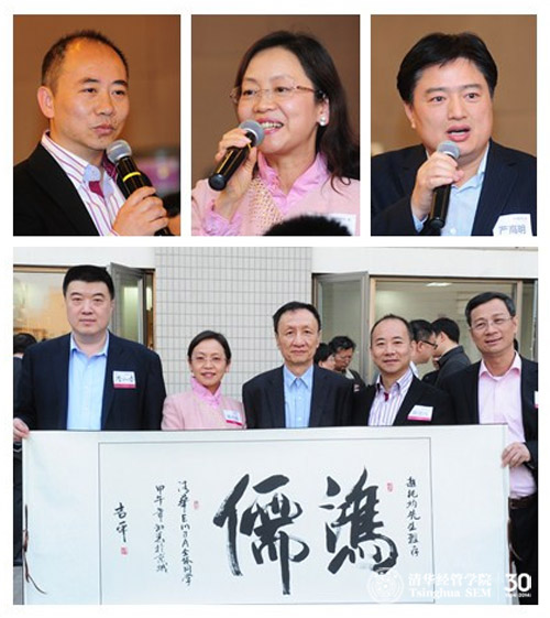 严高明校友(EMBA2002)说,自己是怀着一颗感恩的心回到学院参加这次座谈会的,在清华经管学院就读EMBA的经历改变了很多人的人生。他还回忆起赵纯均老师在七、八年后仍记得自己的一件小事,这让他从中体会到赵老师对人的尊重,这对他的管理工作也颇有启示。曾莉瑛(EMBA2002)所感受到的是,赵老师这一代教育开拓者的艰辛,传承下来,作为清华经管校友应当具有责任感。莫觉凡校友(EMBA2004)也是专程从四川赶来参加活动,赵老师对领导力的解读令他收获颇丰。他们将一幅写着“鸿儒”二字的字送给的赵老师,表达了EMBA学生对赵老师的感激之情。