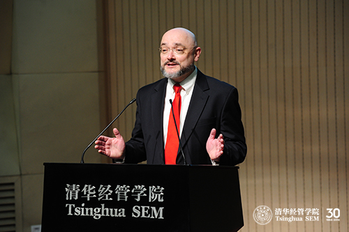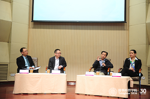 论坛由三部分组成,第一场圆桌讨论,清华经管学院弗里曼讲席教授、中国与世界经济研究中心主任李稻葵与著名经济学家、“休克疗法”之父Jeffrey Sachs,摩根大通国际董事长Dr.Jacob A.Frenkel,针对可持续发展和教育体制改革问题进行了深入探讨。第二部分是学术演讲,国家外汇管理局中央外汇业务中心主任殷勇先生就中国债务可持续性问题做了演讲,清华经管学院金融系宋逢明教授就中国银行业的改革和人才需求这一话题分享了独特的见解和研究成果。第三部分的圆桌讨论围绕国内外的宏观经济形势展开,就怎样有效提升资源配置展开对话。圆桌讨论由清华经管学院金融系何平教授主持,讨论嘉宾分别为美联储高级经济师李灿林先生、高瓴天成投资咨询有限公司董事总经理洪婧女士和清华经管学院金融系朱武祥教授。