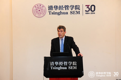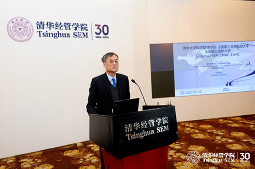 清华经管学院院长钱颖一教授、法国国立民航大学校长马克•乌阿拉(Marc Houalla)先生、法国国立路桥大学国际管理学院国际事务院长柯斯蒂•谭(Kirsty Tan)女士发表了致辞。清华经管学院高管培训中心主任薛镭教授,课程学术主任、清华经管学院管理科学与工程系蓝伯雄教授,空中客车(中国)企业管理服务有限公司用户服务副总裁博思凯(Bruno Bousquet)先生,以及国际租赁融资公司亚太区总裁彼得•张(Peter Chang)先生出席了此次开学仪式。