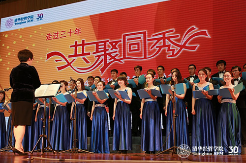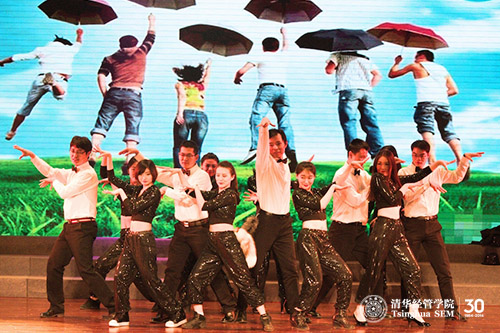 回首30年,清华经管学院及MBA项目的发展历程成为今年晚会的主旋律。《行进光影中的清华经管MBA》开场影像秀,以震撼的开篇气势,拉开了“回首30年”的主题序幕。清华经管MBA合唱团的大合唱《夜空中最亮的星》,歌声悠扬清越,引人遐想;MBA2013级P3班同学自编自导自演的舞台剧《爱是永恒》,情真意切地表现了MBA学生入校、创业、恋爱的典型人生片段与群体缩影;MBA2013级I班以乐队结合劲舞的形式炫出《最爱混搭》的激情,凸显国际MBA学生的风采;MBA2013级F1班的话剧《我们的意见生活》以童话式的拟人手法和特写的方式,记述了MBA学习生活艰辛中充满欢乐的别样情调;分别由MBA2013级F2班和P2班同学表演的舞蹈串烧《青春生活》和瑜伽秀《知行合一》,生动展现了MBA学生充满人文气息的多彩生活;由盲童小朋友与清华经管MBA合唱团等共同演唱的歌曲《HOLY NIGHT》,表现了MBA学生大爱无疆的公益情怀。