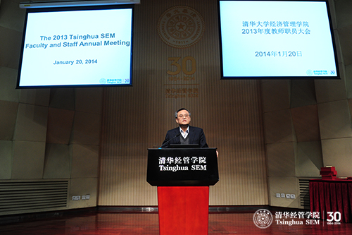 2014年是清华经管学院建院30周年,学院将以“呈现思想、营造欢乐、共享荣耀、感怀情谊”为宗旨,从2014年3月起举办系列论坛和欢聚活动,展现学院的三十风采。展望2014年,钱颖一院长说,我们不仅要把各项院庆活动办好,而且还要以此为契机,认真思考如何为学院的下一个30年发展奠定基础。