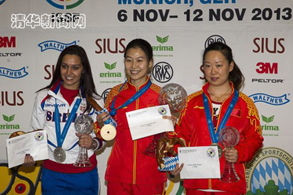 图为易思玲(中)获得射击世界杯总决赛金牌