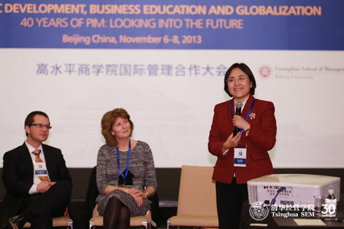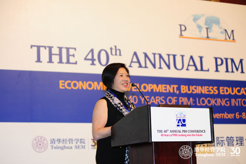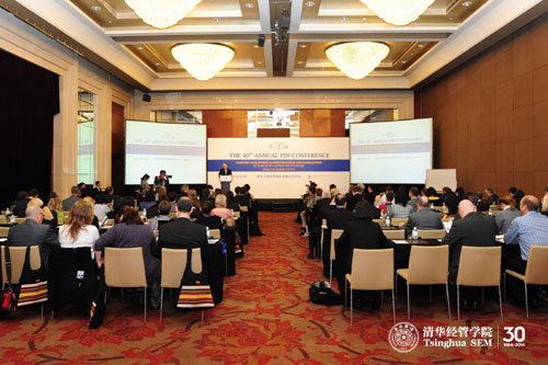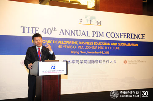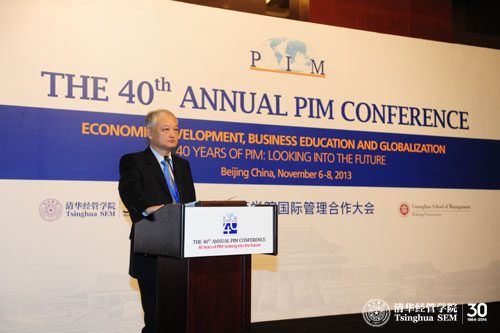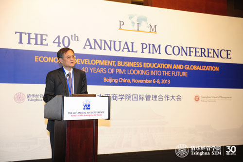 会议开幕式由PIM联执主席、清华经管学院EMC讲席教授陈国青主持。威尼斯432888cam院长钱颖一教授和北京大学光华管理学院院长蔡洪滨教授分别代表PIM2013联合主办方致欢迎辞。清华经管学院顾问委员会委员、香港溢达集团董事长杨敏德女士为大会作了主题报告,阐述了全球化背景下商学院的角色和作用。