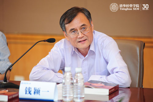 座谈会上,清华经管学院钱颖一教授首先发言。他说,此次在清华经管学院举行清华师生学习《朱镕基上海讲话实录》座谈会,是继2009年9月举行的学习《朱镕基答记者问》座谈会、2011年9月举行的学习《朱镕基讲话实录》座谈会之后,学院举行的第三次学习朱镕基院长新书的座谈会。从1984年经管学院建院开始,朱镕基教授担任首任院长。后来他调任上海市市长,仍然担任学院院长,指导博士生。之后回到北京担任国务院领导,在此期间他也一直担任清华经管学院的院长,直到2001年。从2000年开始至今,他一直担任学院顾问委员会的名誉主席。在近30年中,朱镕基院长与清华经管学院结下不解之缘,学院师生对老院长感情深厚。