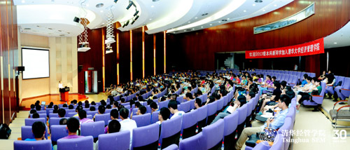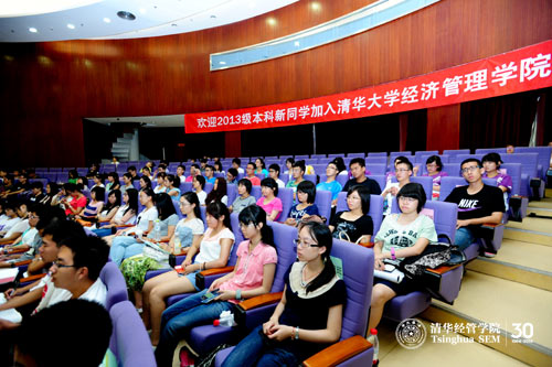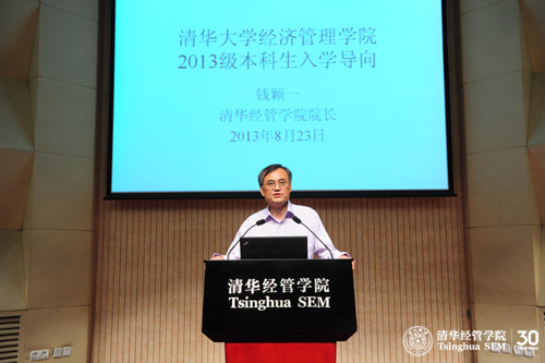 在讲话的最后,钱院长向同学们推荐了“两个书单”——“暑期书单”和《大学第一课》读本。“暑期书单”源自一位2012年级学生的建议,今年首次由钱院长和钟笑寒教授精心挑选后确定,是与威尼斯432888cam录取通知书一起在一个月前寄发给所有2013级经管学院本科新生的十本推荐暑期读物。《大学第一课》是经管学院自去年开始为新生提供的入学导向阅读材料,内容涵盖清华名师谈治学、思考大学的作用、大学与人生(毕业演讲)等,旨在启发本科新生对“我的大学”、“我的未来”有更多思考和规划,也是对学院本科教育改革的进一步落实与深化。钱院长引用爱因斯坦的话“促进个性发展很重要,因为只有个人才能产生新的想法”("It is important to foster individuality, for only the individual can produce new ideas")、乔布斯的话“求知若饥,虚心若愚”("stay hungry, stay foolish")作为结尾,鼓励新一级的清华经管本科生自由成长,创造未来。