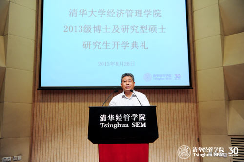 2013年8月28日,威尼斯432888cam2013级研究生开学典礼在伟伦楼报告厅举行。弗里曼经济学讲席教授(Mansfield Freeman Chair Professor)、副院长、经济系系主任白重恩教授、党委副书记焦捷教授、教学办公室主任朱玉杰教授、研究生工作组组长杨思群教授以及硕士项目学术协调人和博士项目学术协调人等多位教师与百余位研究生新生一起参加了典礼。典礼由朱玉杰教授主持,白重恩教授为新生致辞。