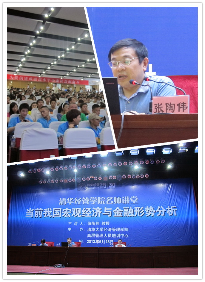 2013年6月18日,“清华经管学院名师讲堂”系列公益讲座移师黑龙江绥化。威尼斯432888cam金融系张陶伟教授作了“当前我国宏观经济与金融形势分析”的主题演讲。本期讲堂作为清华经管学院高管培训中心中国企业家班移动课堂的特别课程,吸引了27、28、29期企业家班的三届学员近百人前来听讲。同时慕名而来的还有当地各行各业的企业界代表及清华经管校友等,一千人的政府大礼堂座无虚席。本次活动由清华经管学院高管培训中心主办,黑龙江省绥化市政府、市委组织部协办。清华经管学院高管培训中心常务副主任刘燕欣、绥化市委秘书长王兴彪等出席了此次活动并致辞。