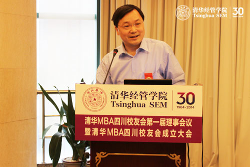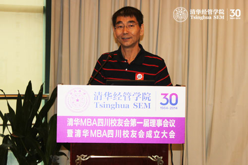 郦金梁教授代表学院致辞祝贺清华MBA四川校友会的成立。他表示,校友是学院长期的利益相关方,校友工作是学院工作的重要内容,校友组织是“清华梦”延续一生的组织保证。郦金梁教授赞扬MBA四川校友会在成立之初就开展校友公益活动,表示达济天下、关注民生是清华品格的重要组成部分并希望校友积极参加院庆30周年的各项活动,欢迎大家明年院庆时返校。