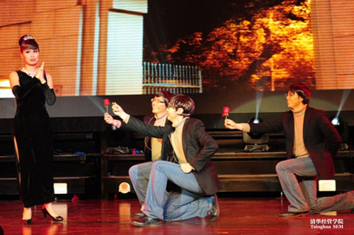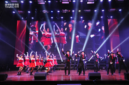 一年一度的清华MBA共聚同秀晚会,是MBA学子最具开放精神、最能体现班级凝聚力和个人才艺的活动。在如山的作业和沉重的考试压力下,MBA同学们仍然投入了非常多的时间和精力准备晚会节目。航母STYLE、江南STYLE纷纷出动,毕业季引来“皇帝选妃”,迈克尔•杰克逊与僵尸“共舞”等好戏接连上演。而给大家留下最深印象的还是由2012级P4班黄咿婧导演、近30位同学登台表演的原创小品“大咖赶考戏清华”,小品以戏说的手法讲述了一众“大咖”:埃及艳后、玛丽莲•梦露、奥黛丽•赫本、蓝精灵、超人等名人纷纷“穿越”,报考清华MBA的趣事。