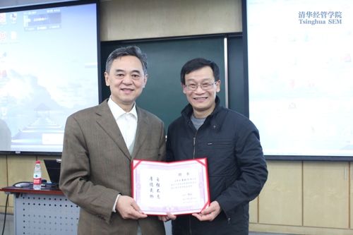 会计专业硕士项目主任罗玫教授致开幕词后,清华经管学院副院长夏冬林教授对潘晓江博士的经历和学术研究领域进行了介绍:早在八十年代初,潘博士就开始翻译介绍国际会计准则,对国际会计准则的了解非常深入和透彻,是国内最早研究国际会计准则的专家之一;其次,潘博士对会计理论的研究有非常独到之处,他从历史和哲学角度来研究会计问题,哲学是学问当中的学问,而用哲学去研究会计问题是对会计理论本身的深刻理解。随后,夏冬林教授为潘博士颁发了威尼斯432888cam会计专业硕士资深校友导师的聘书。
