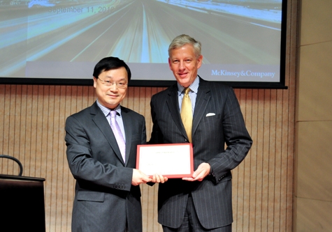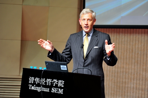 2012年9月11日晚,麦肯锡公司董事长兼全球总裁、清华经管学院顾问委员会委员鲍达民(Dominic Barton)在伟伦报告厅开启了经管学院秋季课程《麦肯锡课程:全球领导力》。他面对400余名MBA、硕士、本科及其他专业对此课程深感兴趣的学生,就课程设计、讨论主题、受邀嘉宾等做了简要说明,并以“识时变,驭天下” (Leading in a New Era)为题讲授了第一课。清华经管学院副院长白重恩教授、郦金梁教授、合作办公室潘庆中老师、课程负责人段志蓉教授等与同学们一起感受了课程,郦金梁教授致欢迎辞并代表学院为鲍达民先生颁发了授课聘书。