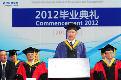 老师和同学们:人生有涯,学海无涯。我们将把毕业典礼作为崭新的起点,不断向着更高的目标开拓进取。我们一定会把清华“自强不息、厚德载物”的校训发扬光大,做博学睿智、志存高远的栋梁之材。