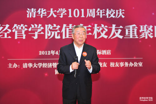董新保老师代表学院全体离退休教师致辞。首先,他对来自全国各地以及海外的值年校友返院参加清华101周年校庆活动表示欢迎;其次,他感谢校友在各自岗位上所做的贡献,赞扬大家为祖国服务、为百姓服务的精神;第三,希望校友们继续奋进,做出更大的成绩,为清华经管学院的发展壮大做出更多努力。