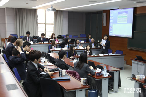 开课当天,在清华经管学院带队老师于春玲教授主持下,来自台湾政大的16名学生分别就大陆与台湾地区的金融市场、零售业、经济形势、人力资源管理、自主创业、政治与法律体系、文化价值观及其对商务的影响、市场及商务往来等八项课题分享了他们对大陆地区商业的认识与分析,台湾政大同学的课题研究准备充分、内容详尽,令清华MBA同学们颇为佩服。